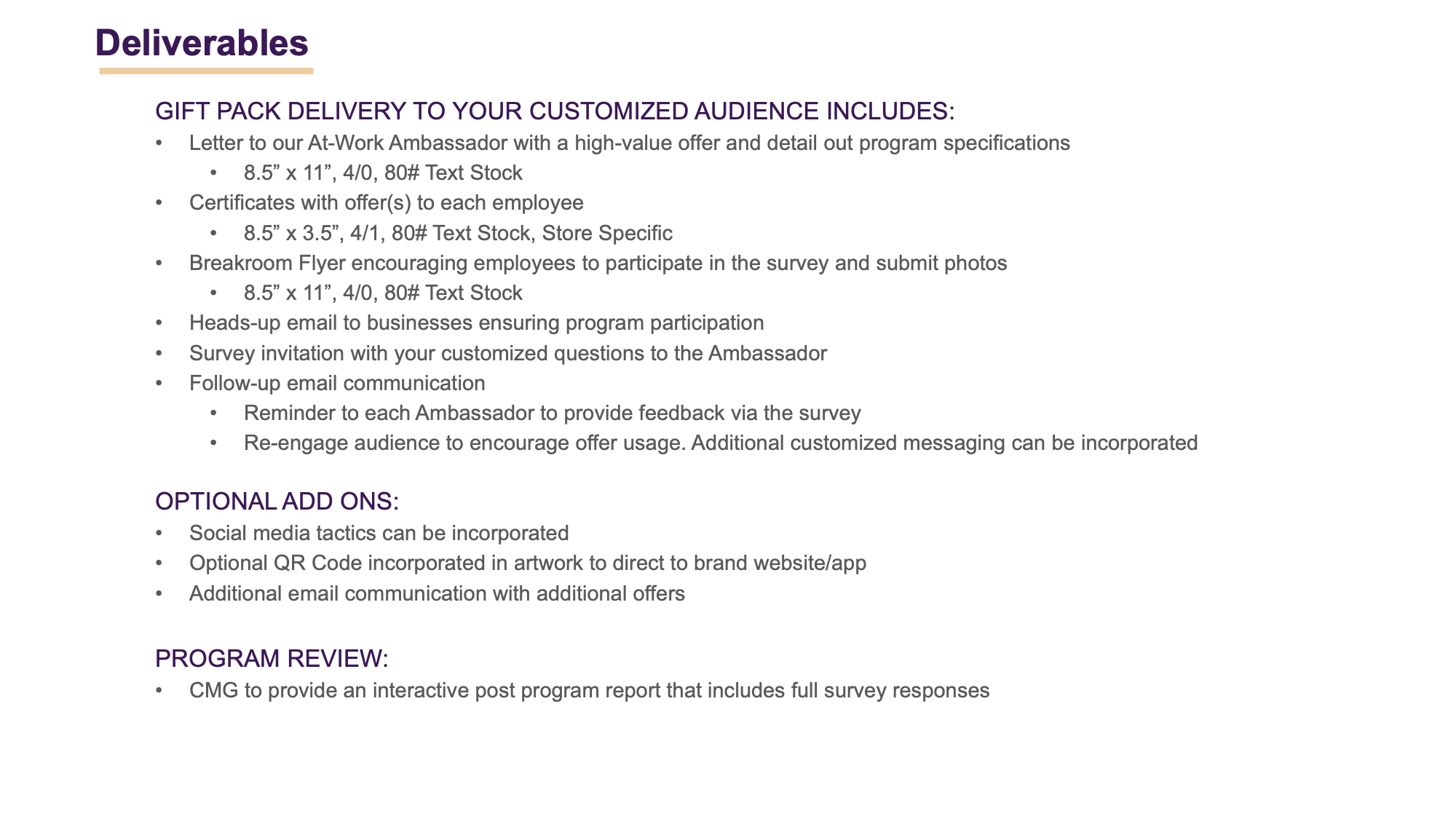 Detailed Campaign Analytics will be provided, including full responses and photos when used, to deployed Ambassador survey. Receive fullfillment details including numbers of samples distributed.