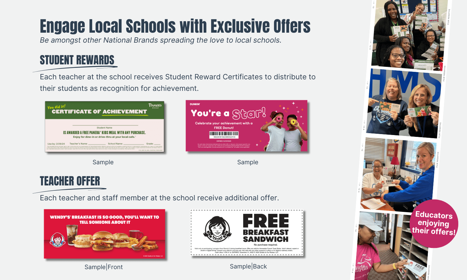 Delivery Process – Each participating school appoints an “Ambassador,” such as an Office Manager or Administrator, who enthusiastically receives and distributes your promotional offers.